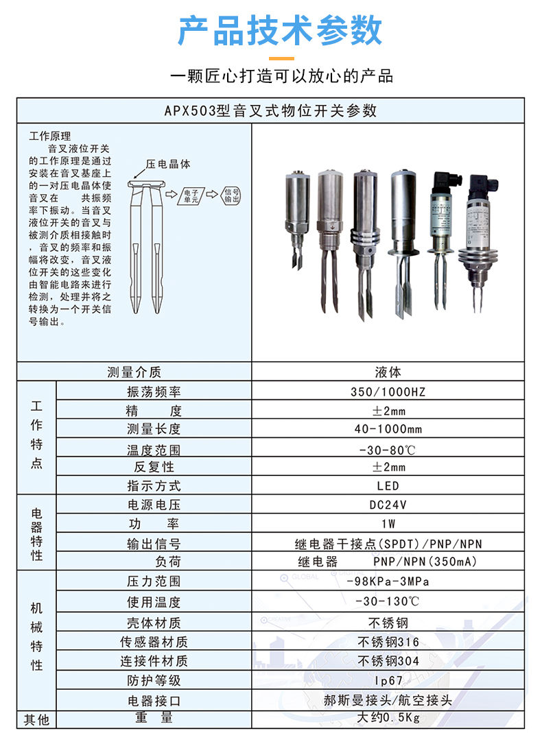 選擇音叉的固有頻率(約1300Hz),一防止受到設(shè)備振動的干擾,這種干擾可能引起錯(cuò)誤的開關(guān)動作,音叉的長度較短從而使伸入容器或管道的長度達(dá)到最短,由于該產(chǎn)品的設(shè)計(jì)采用短音叉技術(shù),因此實(shí)際上可用于所有液體應(yīng)用場合。大量的研究已使音叉設(shè)計(jì)達(dá)到最高的運(yùn)行頻率,從而使該產(chǎn)品適用于所有的液體,包含涂覆液體(消除音叉粘連搭接)、充氣液體和漿液。